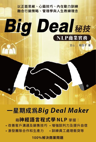 | 《Big Deal秘技 NLP商業實務》 網購編號:L12 ![]() | (原價$108)直銷: 特價港幣HKD$98 (順豐到付 [僅限香港] ,貨到才付運費) 或 特價港幣HKD$108 (連郵費,郵局自助取件,不送貨上門) 或 特價港幣HKD$128 (寄掛號) 按此購買 | 電子書未開放 |